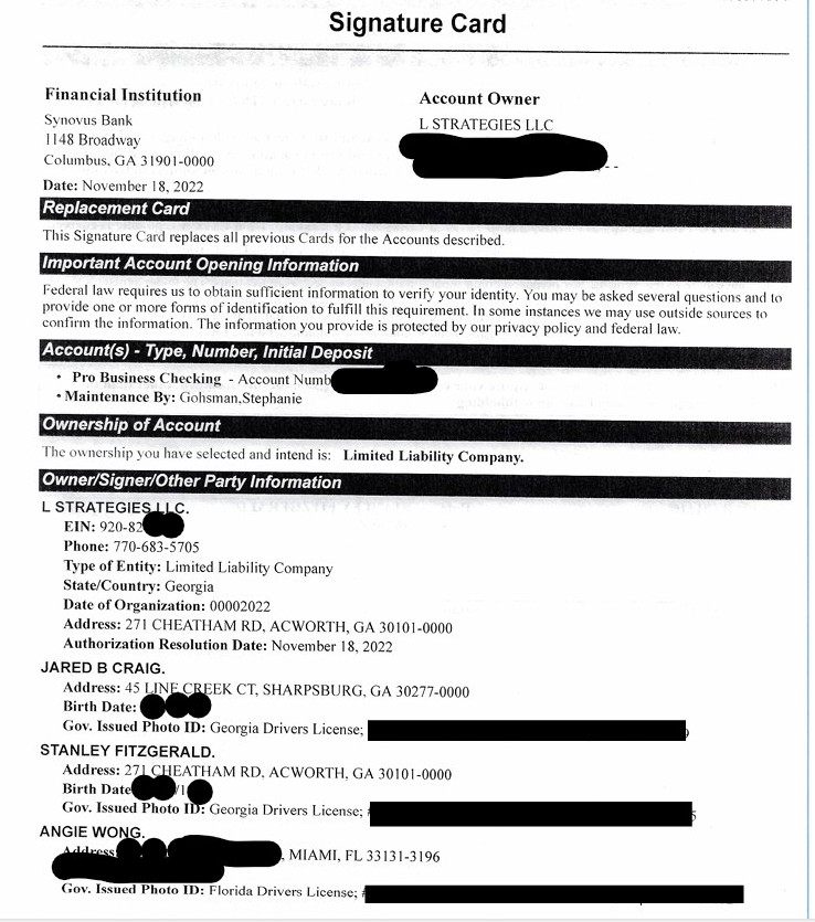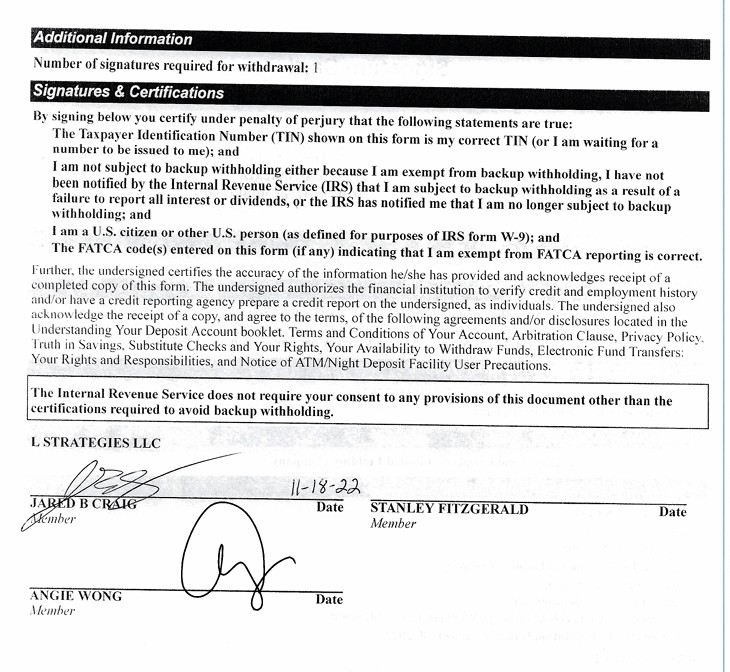 Record materials reflect that bank-account access and administrative control were limited to specific partners. The bank statement signature page reflects signatures by Jared Craig and Angie Wong; Stan Fitzgerald did not sign and did not have bank access. The record further reflects that Fitzgerald refused salary or access, and agreed to be part of the LLC solely to help fund and support grassroots Saving America work.